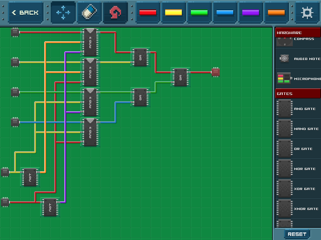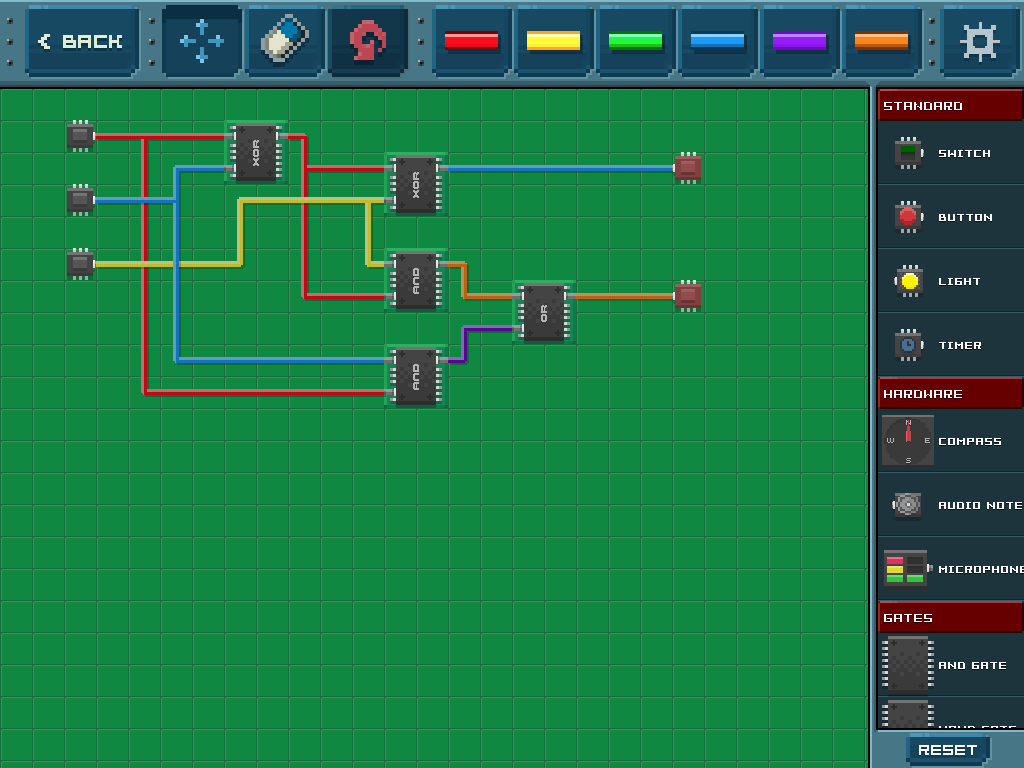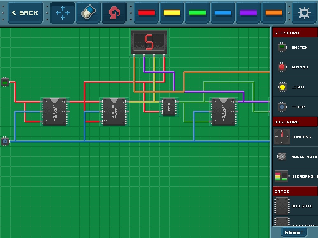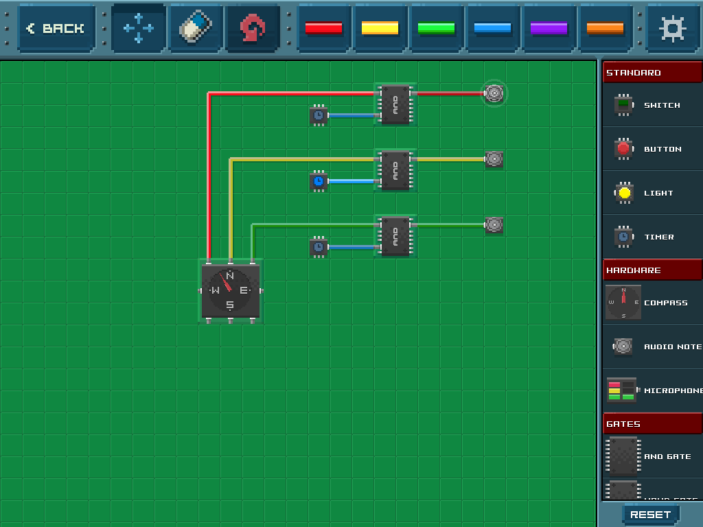Based around a simple grid system, creating circuits is as simple as dragging tiles onto the board, draw wires connecting the tiles up and see it all work instantaneously in an always-on environment.